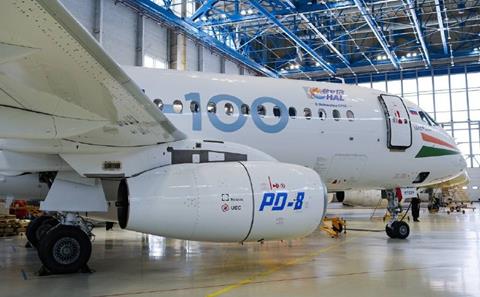 The SJ-100 will carry a special livery with “elements” of the Indian national flag, it adds. United Aircraft first flew the production-example SJ-100, which is powered by Aviadvigatel PD-8 engines, in September last year.