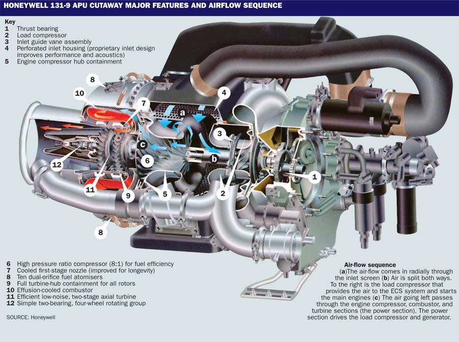 Honeywell says the dual-alloy one-piece turbine wheels will provide some operators with a 10-20% increase in APU life, which for the 131-9 is on average about 12,000h time before overhaul (TBO). Interim maintenance typically includes replacing certain line replaceable units (LRU) during the life of the APU in part due to internal wearing of valves, mating materials and springs. Replacement parts include igniter plugs and filters.