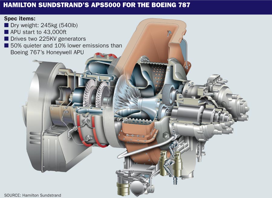 Beyond the 787, Hamilton Sundstrand plans to take advances from the 787 programme into a new line of single-aisle APUs, a strategy aimed at taking market share from its competitor. Di Perna says Honeywell is dominant in the single-aisle market, with a 75-80% share compared with Hamilton Sundstrand's 20-25%. "We're trying to get 35-45% market share in the next seven years," says Di Perna. He says both companies have approximately 40% market share in military APUs and 50% each for regional aircraft.