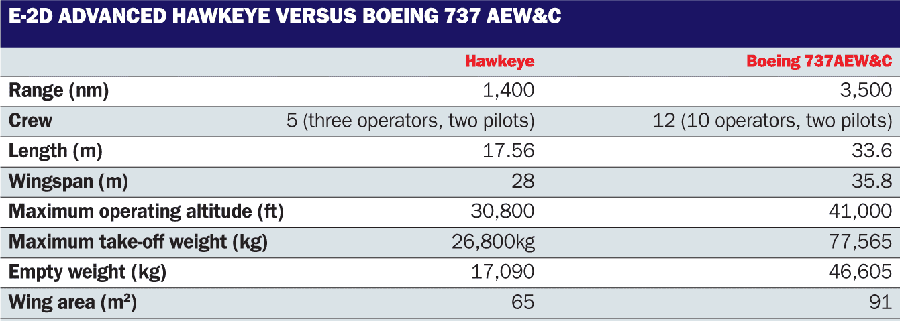 Nonetheless, the E-2D will perform the modern AEW mission with a 26,800kg (57,500lb) maximum take-off weight that one of its competitors - namely, the Boeing 737 advanced early warning and control platform - needs 63,280kg of combined mass for airframe, mission payload and fuel to execute.