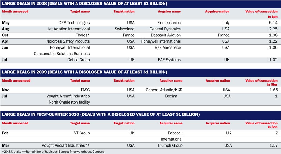 In the whole of 2009, there were just two deals that broke the $1 billion threshold: Vought's North Charleston plant came under Boeing ownership in a $1 billion third-quarter deal, and in the fourth quarter General Atlantic and KKR bought TASC for $1.65 billion. There were seven $1 billion-plus deals in 2008, and this year's total "could match or exceed" that, in PwC's view.
