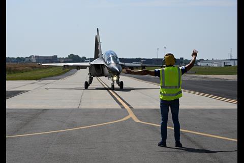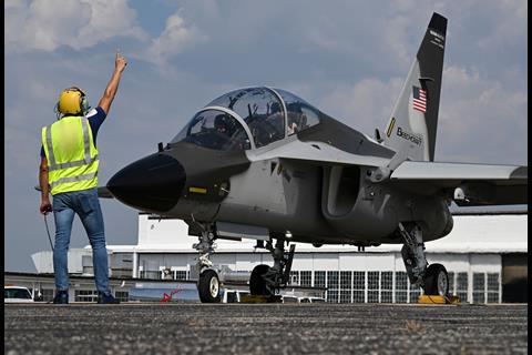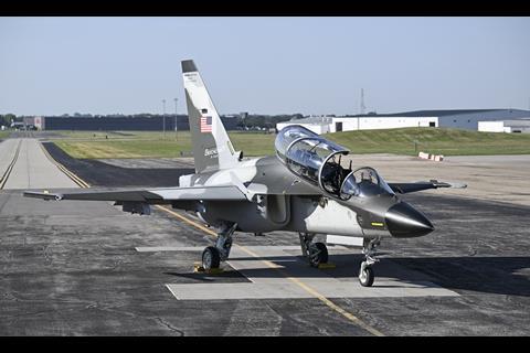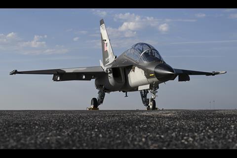 The M-346N Beechcraft test demonstrator was first assembled in Italy, then disassembled and shipped to Wichita, where it was re-assembled and is now flying from Beech Factory airport – home to the original Beechcraft delivery centre.