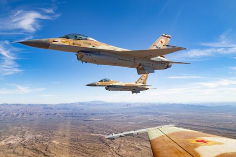 Those aircraft were procured second-hand from the Israeli air force and feature the distinctive desert camouflage livery and Top Aces’ red star tail flash. The F-16 fleet provides dedicated aggressor air support to USAF squadrons flying the Lockheed F-35A.