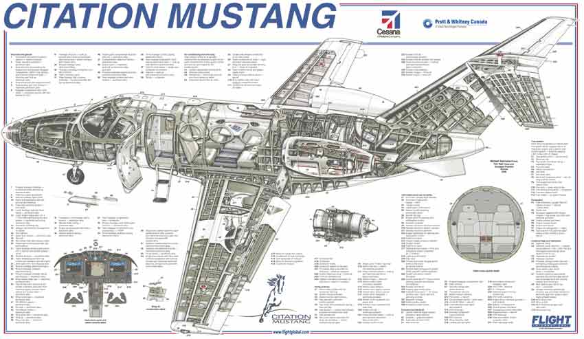Flight International was able to saddle up the newest Citation and fly the Mustang from Wichita's Mid-Continent airport. Cessna test pilot Don Alexander highlighted some of the entry-level jet's strong points during the pre-flight walk-round inspection. There are two exterior baggage compartments, one in the nose and one in the tailcone. Both are easily accessible from ramp level, with the rear compartment featuring a ski tube. For flight into known icing conditions, the leading edges of the wing and both horizontal and vertical stabilisers are booted. The eight vortex generators embedded in each wing leading-edge boot and the two ventral strakes positioned under the tailcone were added during flight testing to improve handling qualities, particularly for inexperienced pilots.