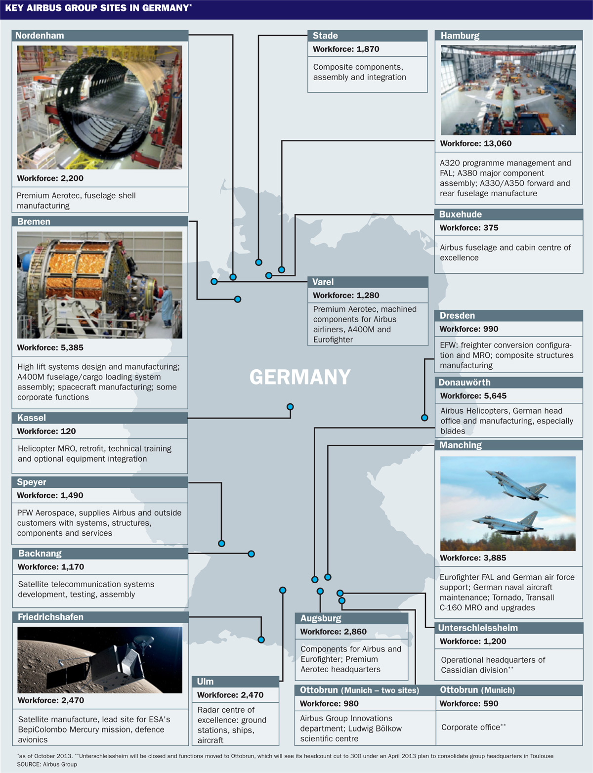 In Germany, a major site at Unterschleissheim near Munich will close, with its functions moved to Ottobrunn. The Paris corporate office at Montmorency will be sold and its functions moved to Suresnes, where the corporate technical office is already based.