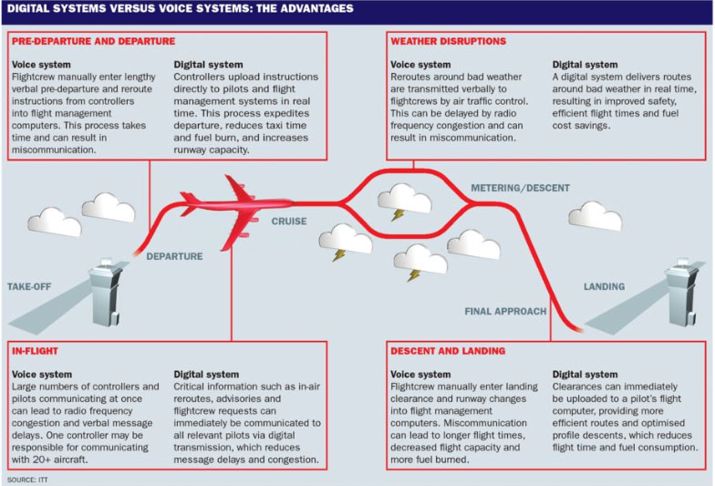 ADS-B provides precision surveillance data without radar, allowing more efficient flightpaths. Similarly, data comm will boost capacity by transferring the messages that have traditionally connected aircraft to controllers - a barrage of back-and-forth voice transmissions, particularly in the terminal environment - to text. Moving to text messaging from voice will also boost safety by eliminating communications errors such as language barriers.