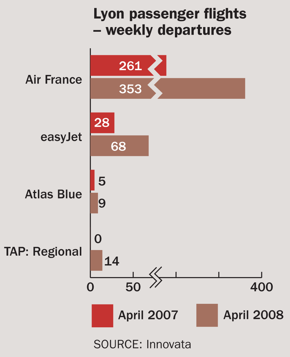 Another UK carrier that has been rapidly expanding in France is regional low-cost operator Flybe, which over the last year has increased the number of weekly departures from CDG from 19 to 91 (see charts of Charles de Gaulle and Lyon departures). Flybe chief commercial officer Mike Rutter says the carrier has "more routes to France than any other carrier from the UK", and is looking at further growth, with Lyon being "a very attractive area". Flybe had been planning to establish a number of bases in France from which to set up a French domestic operation, but these plans were put on ice when the carrier acquired BA Connect.