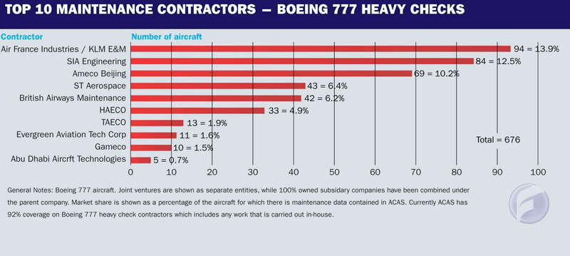 If the enormously popular 777 family is taken as a case study, AFI-KLM is found to extend its lead with a 13.9% share. Three Asia-headquartered providers complete the top four: SIA Engineering Company on 12.5%, Ameco Beijing on 10.2% and ST Aerospace on 6.4%. Yet the market is still a fragmented one, with only the top six holding more than 2% each and the top 10 as a whole accounting for less than 60%.