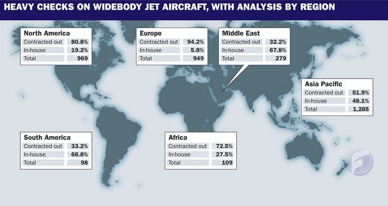 Airlines' tendency to outsource widebody maintenance continues to vary widely by region. In Europe the phenomenal success of the low-cost model, with its focus on core competences, is reflected, albeit indirectly, in the huge majority of aircraft that are maintained by third-party providers. Just 5.8% of 949 widebody aircraft are maintained in-house, suggesting that widebody operators have been forced to embrace low-cost principles to remain competitive.
