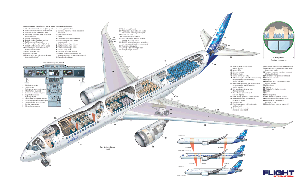 The effort to reach MG5 for the A350-800 is "simpler", says Evrard becauseit is effectively a shrink of its big sister, with six frames removed forward of the wing and four aft.