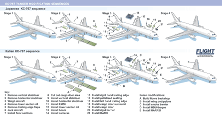 The first aircraft for Japan, meanwhile, is nearing completion in Wichita and is to make its first flight in late October. Given the pathfinding role of the Italian aircraft and the simpler configuration of the Japanese aircraft, the KC-767J flight-test effort is expected to require around 100h, most of it focused on the ECS, unique avionics and an encrypted radio package.