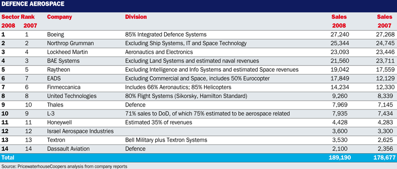 Overall, the defence aerospace industry maintained its momentum, with the top 15 companies or divisions growing 6%, against a comparable figure of 7% for 2007. However, behind this headline figure PwC detects the impacts of "flatter defence procurement spending, a focus on land systems and network warfare and less procurement of air systems": Boeing's Integrated Defence Systems unit failed to grow and Lockheed Martin's aeronautics and electronics business shrank 1.5%. Northrop Grumman, meanwhile, managed only modest growth, of 2.4%, in its defence aerospace business.