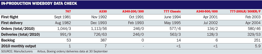 One of the three types is quickly dealt with. The A340 appears to be rapidly nearing the end of its production life. The four-engine type had an order backlog of just seven at the end of 2009 and only two additional orders - of -500 models - had been booked by 30 September this year.